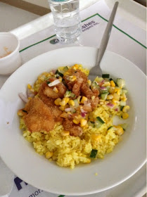 My lunch, garlic rice, with chopped cucumbers, tomato, onions, fried fish. It was delicious!
